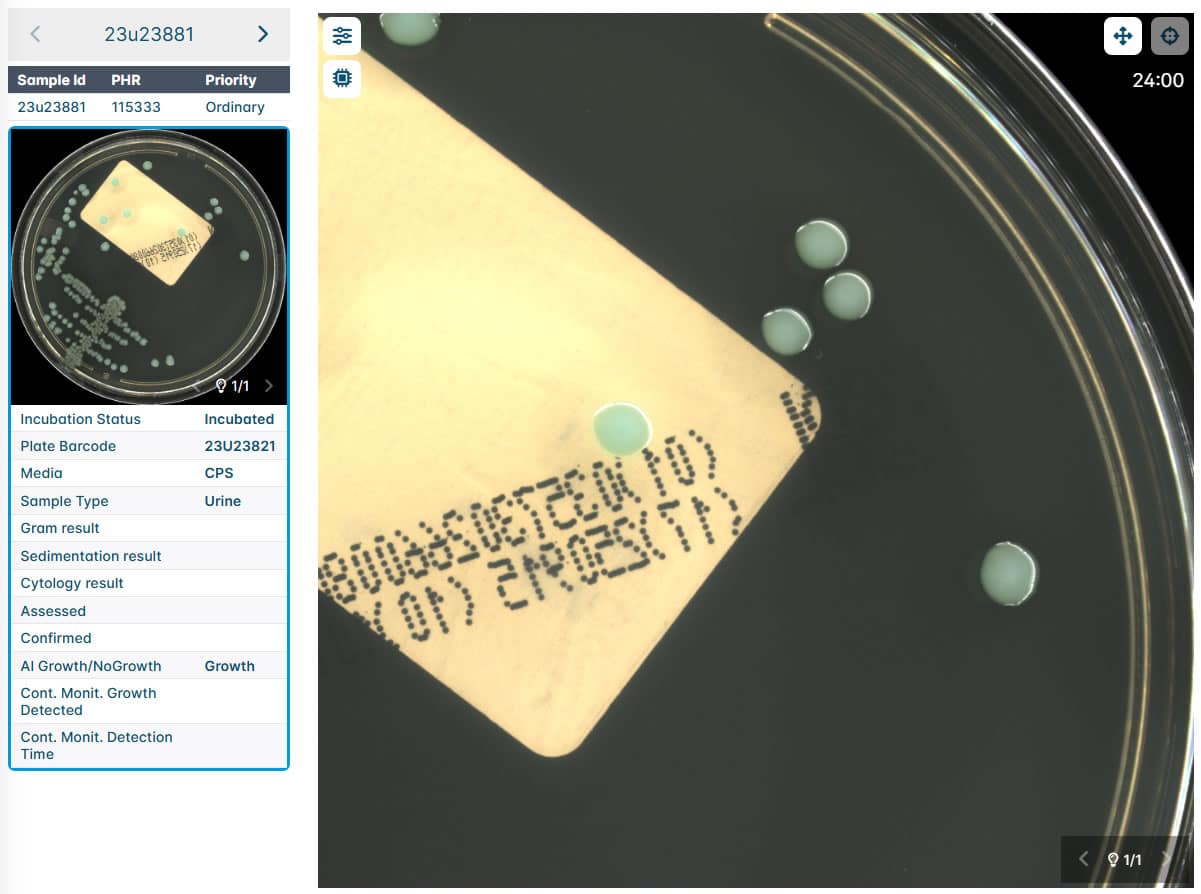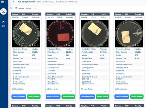 The intelligent incubation system is the only system on the market equipped with 2 complementary imaging systems. A first continuous monitoring system that allows uninterrupted monitoring of sample growth, being capable of generating alarms as soon as growth is detected in the sample. The second system captures the overhead image, digitising the sample and executing artificial intelligence algorithms to determine the characteristics of that growth. This advanced platform that combines time-based and growth-based management protocols, provides the laboratory with a unique tool to address emergency situations, to efficiently optimise workflow processes thus contributing to a more effective operation and accelerated results in the laboratory.