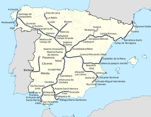 Figura 1: Red española de Alta Velocidad en noviembre de 2023. Fuente: Wikipedia