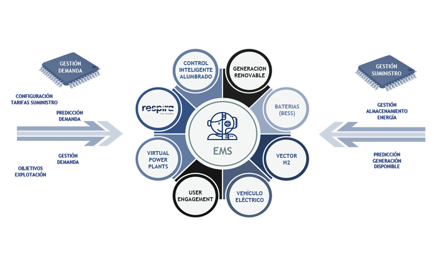 El EMS (Energy Management System) recoge de forma autónoma información de predictores a horas o días vista (meteorológicos, de demanda de consumos, de precios variables de electricidad, gas, etc.) así como información del estado actual de los activos de la microrred (su disponibilidad, niveles de los almacenamientos, de las potencias demandadas y generadas), y con ello, el EMS orquesta una planificación de funcionamiento para cada activo de la microrred (cuánta energía almacenar y cómo, qué cargas desplazar o subir/bajar, etc.) en programas de 15 minutos para las próximas horas o días, para maximizar el objetivo que se haya elegido (reducir coste de consumo eléctrico, minimizar huella energética, etc.). Asimismo, el EMS actualizará automáticamente estas previsiones de operación periódicamente en modo horizonte rodante.